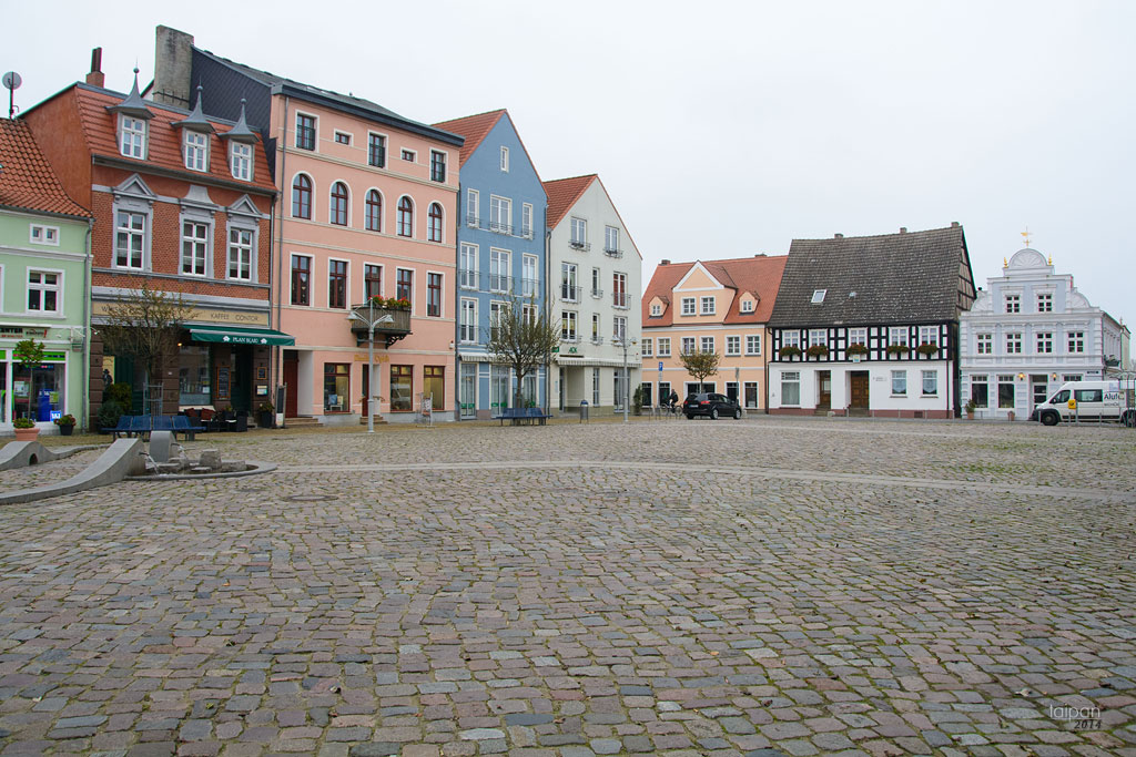 Rynek miasta w Ueckermünde z kolorowymi kamienicami.