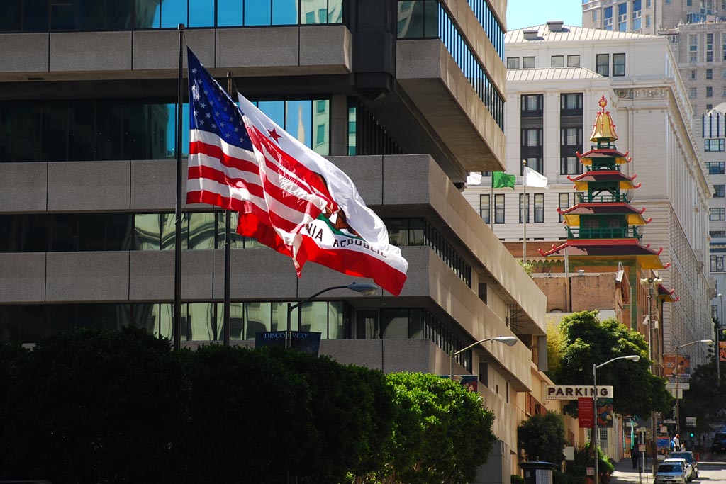 Kalifornia / San Francisco - Flaga USA i Kalifornii poruszone wiatrem