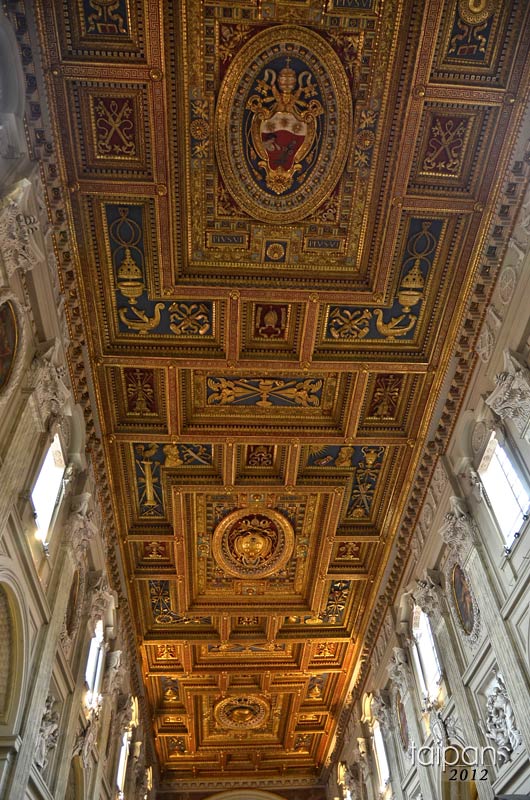 Bazylika papieska św. Jana na Lateranie (Basilica di San Giovanni in Laterano) przy Piazza di San Giovanni in Laterano - bogato zdobiony kasetonowy złocony sufit bazyliki nad nawą główną