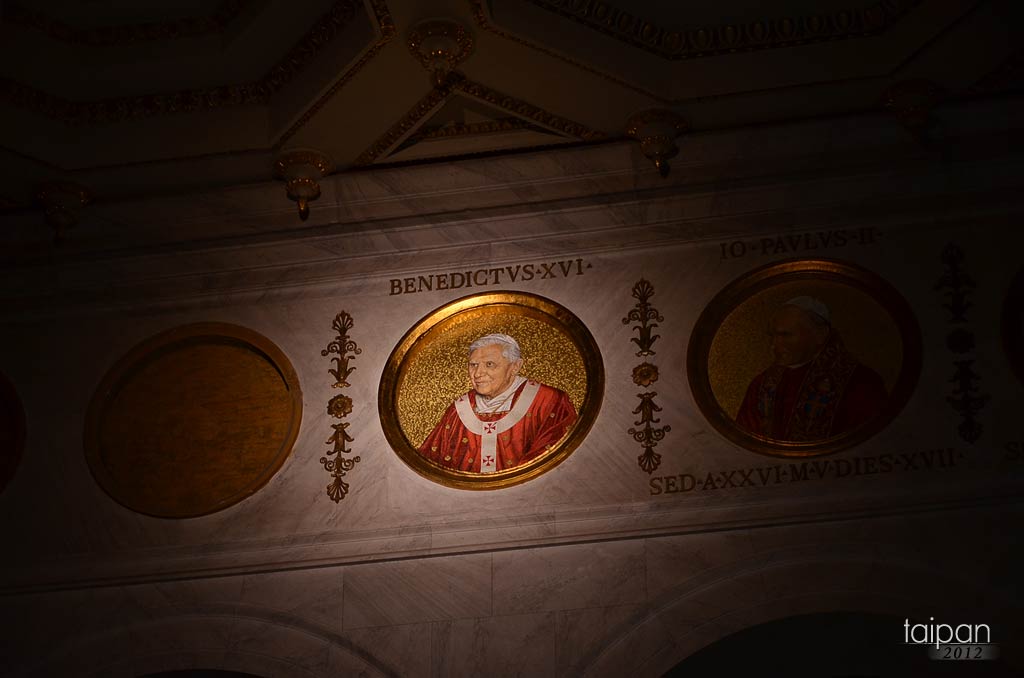 Bazylika papieska św. Pawła za Murami (Basilica di San Paolo fuori le Mura) przy Via Ostiense - podświetlony portret obecnego papieża Benedykta XVI, a obok znajduje się wizerunek Jana Pawła II