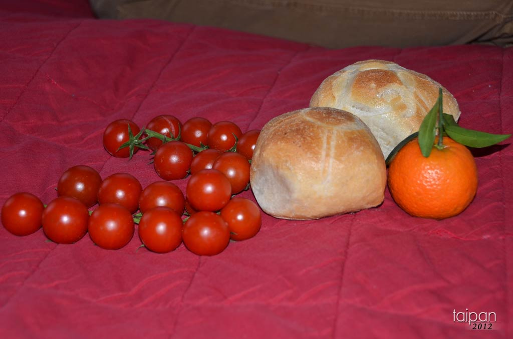 Świeże małe pomidorki, mandarynka i bułka :)