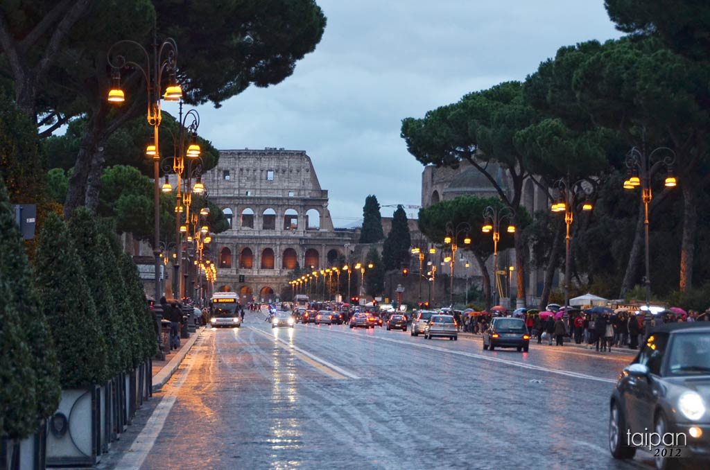 Koloseum - wybudowany w 80 roku na rozkaz cesarza Wespazjana największy amfiteatr Rzymu, mieszczący 73000 widzów, zapewniający w starożytności rozrywkę dla tłumów w postaci walk gladiatorów i dzikich zwierząt. Na zdjęciu widok z Via di San Gregorio