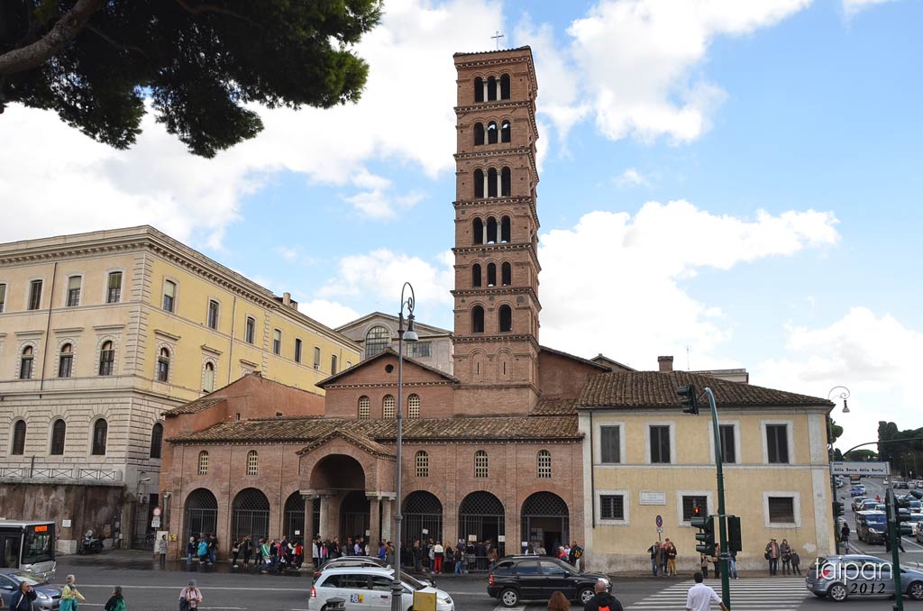 Bazylika Santa Maria in Cosmedin (Basilica di Santa Maria in Cosmedin) przy Piazza della Bocca della Verita - skromny kościół zbudowany w VI w. na miejscu antycznego targu, w pobliżu Circus Maximus. Wieżyczkę dodano w XII w.