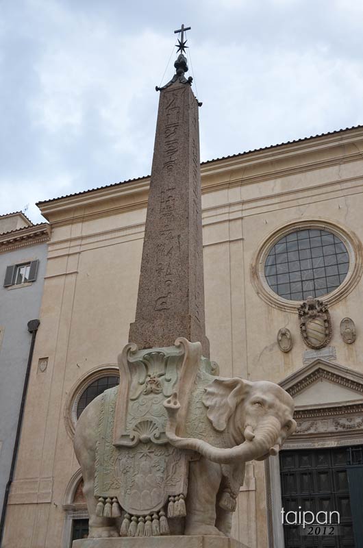 Obelisk Berniniego przed kościołem Santa Maria sopra Minerva, przy Piazza della Minerva. Egipski obelisk został postawiony na słoniu, który w starożytności był symbolem wierności i inteligencji.