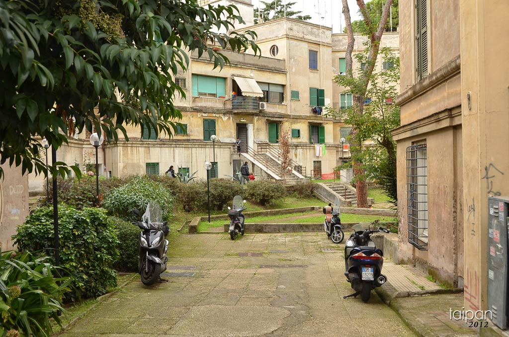 Południowa część Rzymu z blokami, między którymi mieszkańcy parkują swoje komarki :)