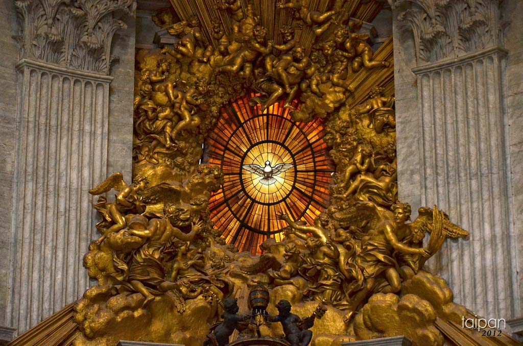 Witraż nad tronem św. Piotra przedstawiający gołębicę symbolizującą Ducha Świętego, wznoszącą się wśród chmur, promieni słonecznych i aniołów - w Bazylice św. Piotra w Watykanie