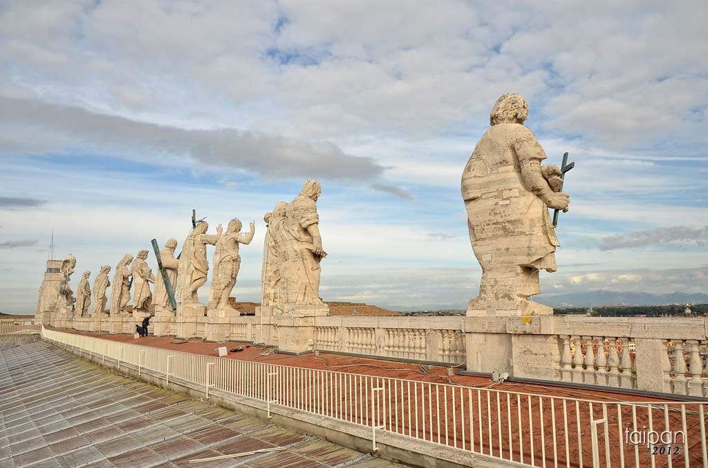 Zwieńczenie bazyliki świętego Piotra w Watykanie figurami Jezusa Chrystusa i 12 Apostołów (bez św. Piotra) oraz św. Jana Chrzciciela