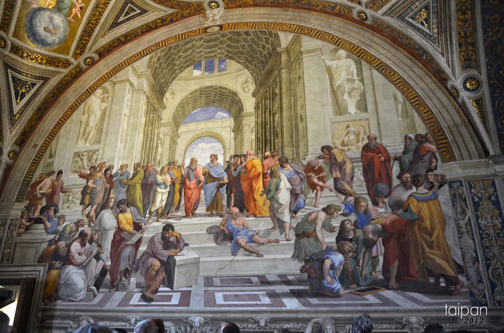 Muzea Watykańskie (Musei Vaticani) w Watykanie. Szkoła Ateńska - malowidło ścienne Rafaela namalowane w 1510 r., na zlecenie papieża Juliusza II