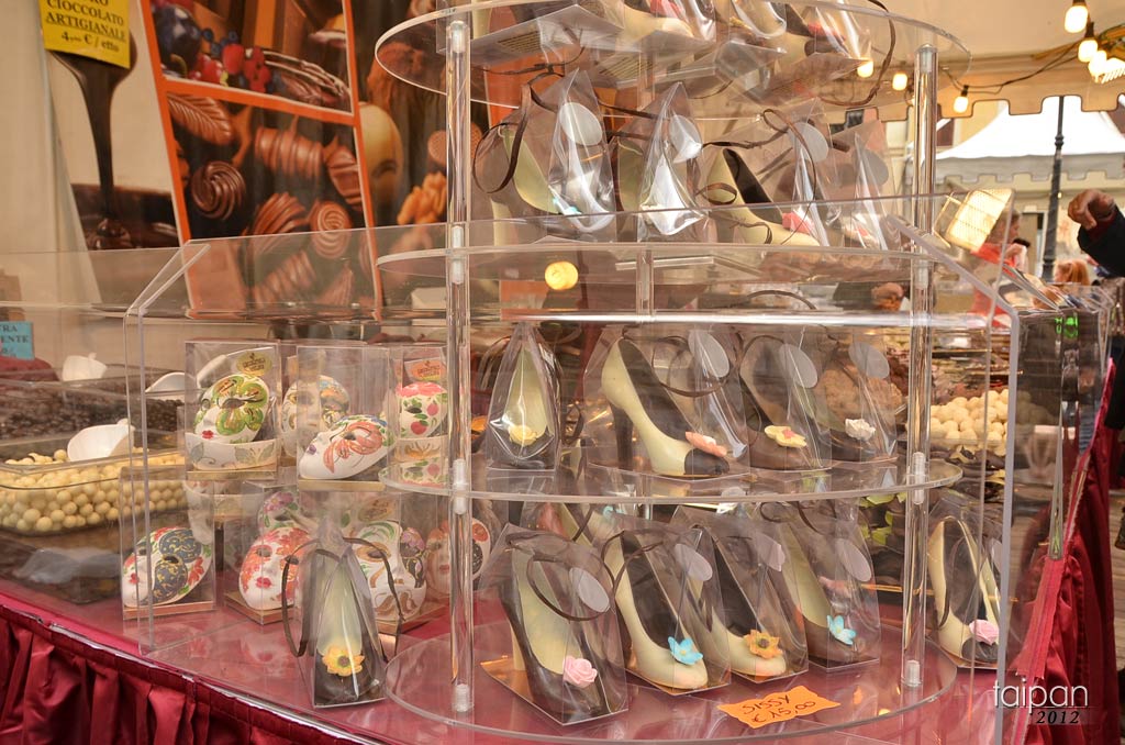 Zatybrze (Trastevere) - uznawana za najstarszą część Rzymu, położona po zachodniej stronie Tybru. Jest to dosyć klimatyczne miejsce, z wieloma dobrymi restauracjami. Na zdjęciu widoczne są maski i obcasy zrobione z czekolady na jednym ze straganów.