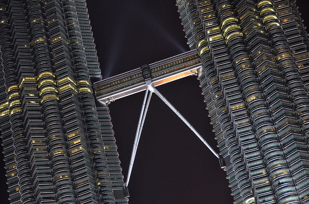 Petronas Twin Towers - bliźniacze wieże w Kuala Lumpur, wybudowane w 1998 roku, są jednymi z najwyższych budowli świata, o wysokości 452 m i 88 kondygnacjach. Na wysokości 41 i 42 piętra (około 170 m) połączone są pomostem. Na dole wieżowców znajduje się centrum handlowe Suria KLCC. Za obiektem znajduje się KLCC Park z kolorowymi fontannami i parkiem.