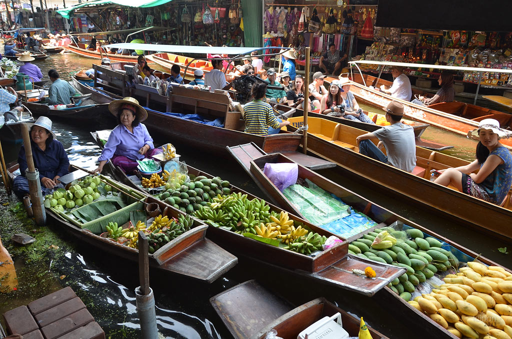 Pływający targ Domnoen Saduak położony jest około 100 km od Bangkoku. Organizowany jest on prawie wyłącznie dla turystów. Jest to labirynt kanałów wodnych o łącznej długości 32 km, po których pływają niewielkie drewniane łódki. Kanał łączący rzeki Mae Klong i Tacheen został wykopany w 1866 roku podczas panowania króla Ramy IV. Płynąc kanałami można obserwować codzienne życie mieszkańców, ich domy z drewna tekowego zbudowane na palach. A głównym atrakcją jest pływający targ, gdzie lokalni mieszkańcy sprzedają z prosto z łódek głównie świeże egzotyczne owoce i warzywa. Na łódkach można kupić także tradycyjne kapelusze oraz inne pamiątki. Niektóre łódki to pływające restauracje, gdzie przygotowywane są świeże tajskie dania.