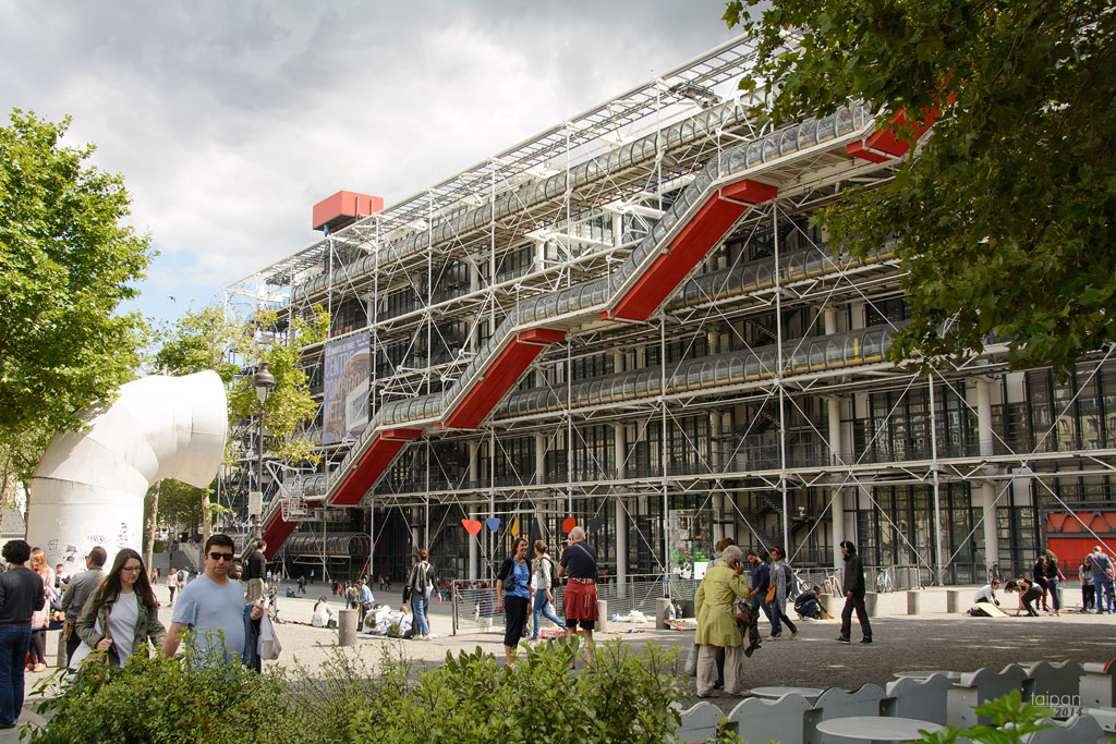 Centre Georges Pompidou - muzeum sztuki współczesnej. Budynek okalają poprowadzone na zewnątrz instalacje elektryczna, wodociągowa, klimatyzacji i inne, pomalowane w różne kolory.