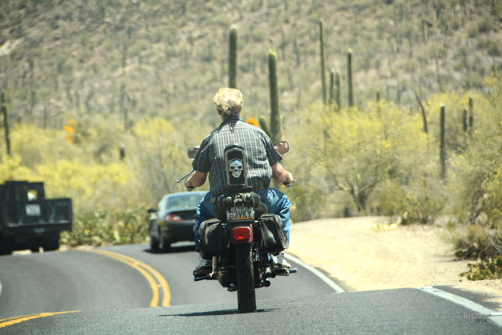 Motocyklista z trupią czaszką na tyle motocyklu mknący przez drogi Tucson w Arizonie.