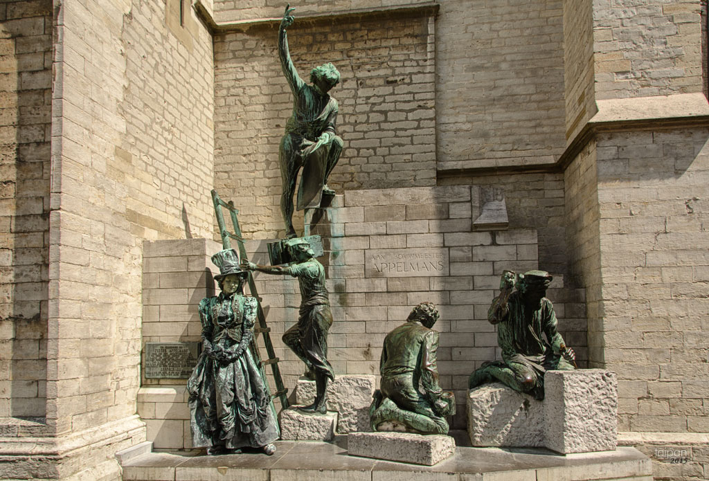 Rzeźby przy katedrze, przy czym jedna z nich jest prawdziwym mimem