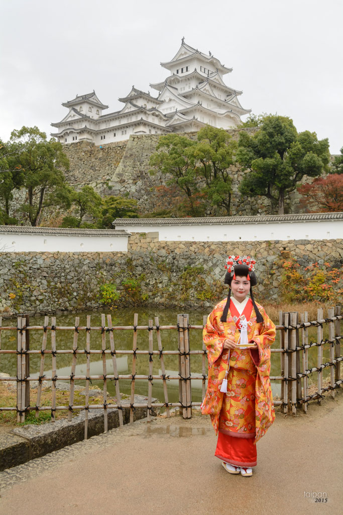 Zamek Himeji - typowo japoński zamek, wybudowany w 1346 roku, wykończony z zewnątrz białym tynkiem gipsowym. Znajduje się na liście UNESCO.