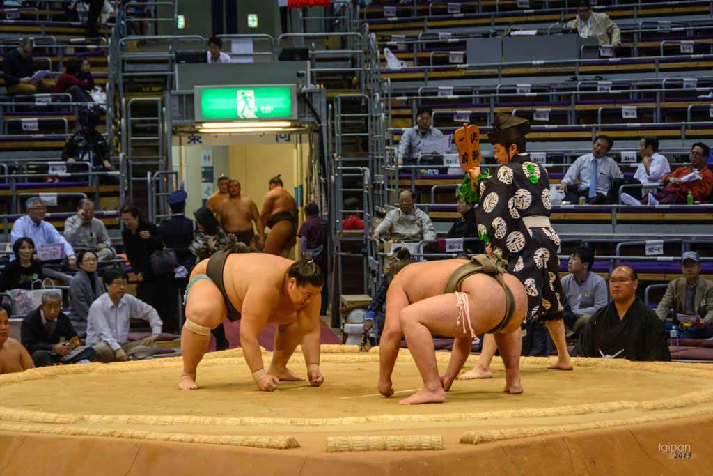 Moment przed starciem.Wielki Turniej Cesarski Sumo - międzynarodowe mistrzostwa świata w sumo rozgrywane w listopadzie w Fukuoce