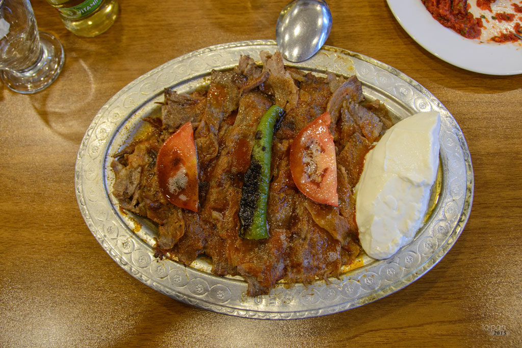 Iskender kebab - kebab podawany z masłem, chlebem, sosem pomidorowym i jogurtem