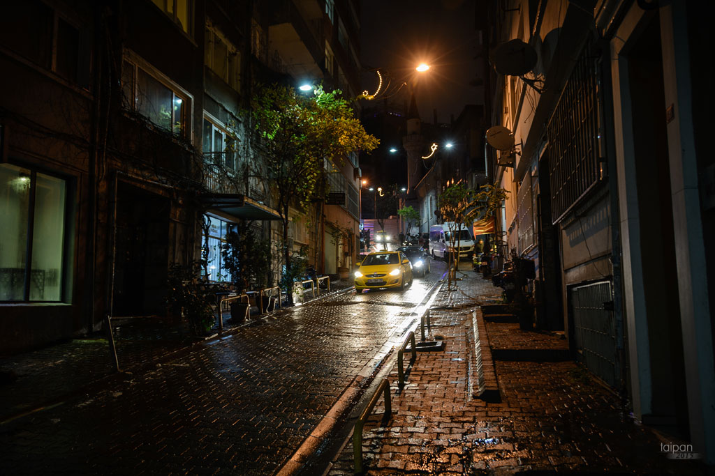 Dystrykt Beyoglu nocą; ulice położone są na wzniesieniach