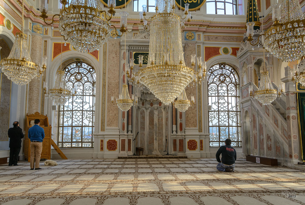 Wnętrze meczetu Ortaköy (Büyük Mecidiye Camii) usytuowanego nad cieśniną Bosfor, w pobliżu Mostu Bosforskiego. Zbudowany w połowie XIX wieku, z białego kamienia. Jest jednym z najpiękniej położonych świątyń w mieście.
