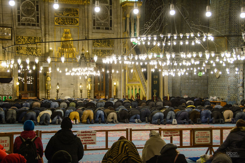 Modlący się mężczyźni.Nowy Meczet (Yeni Cami), położony jest przy porcie Eminönü. Jest jednym z najpiękniejszych meczetów w Stambule. Budowa obiektu zakończyła się w 1663 roku.