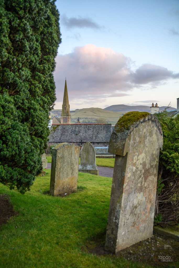 Stary cmentarz przy kościele widziany na tle miasteczka Biggar.