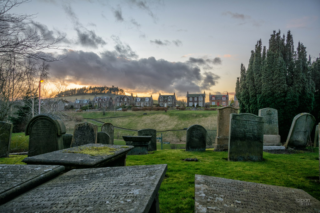 Domki wybudowane na wzgórzu widziane ze starego cmentarza w miasteczku Biggar.