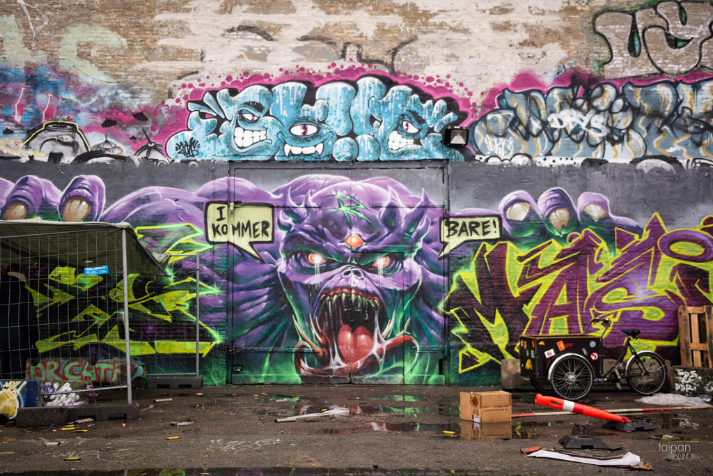 Graffiti...Wolne Miasto Christiania - częściowo samodzielne osiedle Kopenhagi, której mieszkańcy posiadają status niezależnej społeczności. W miejscu tym obowiązuje dodatkowy kodeks praw. Nie można na przykład używać samochodów, biegać, robić zdjęć miejscowym.