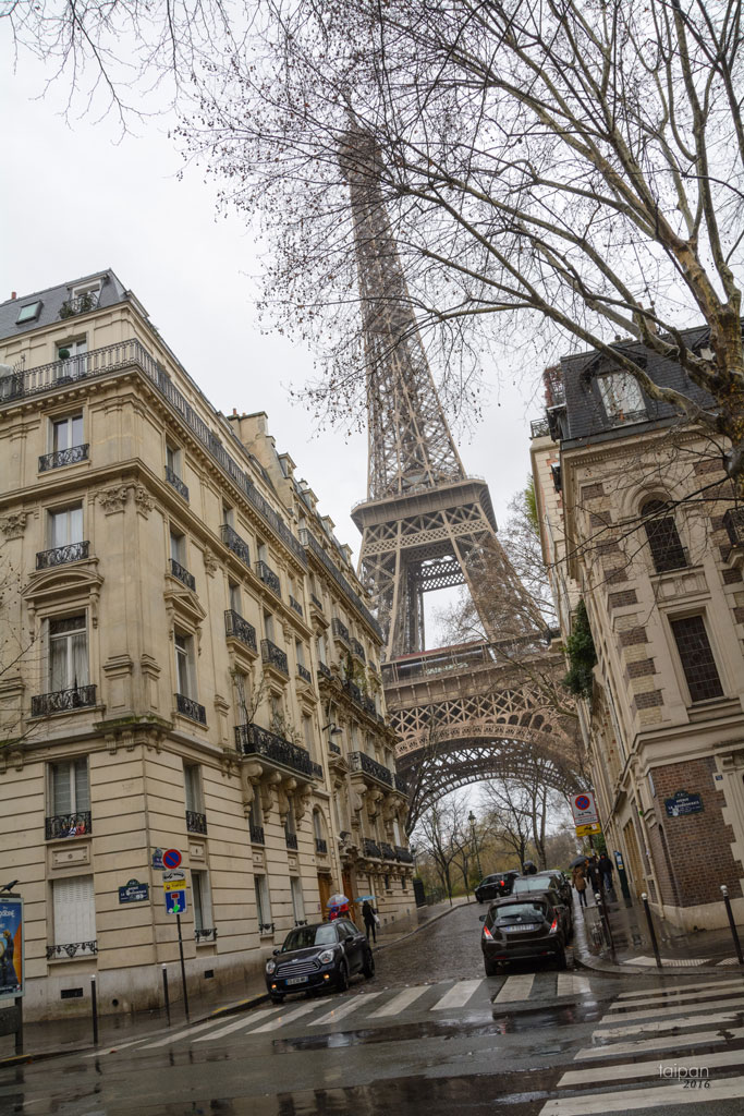 Wieża Eiffla widziana z jednej z pobliskich uliczek