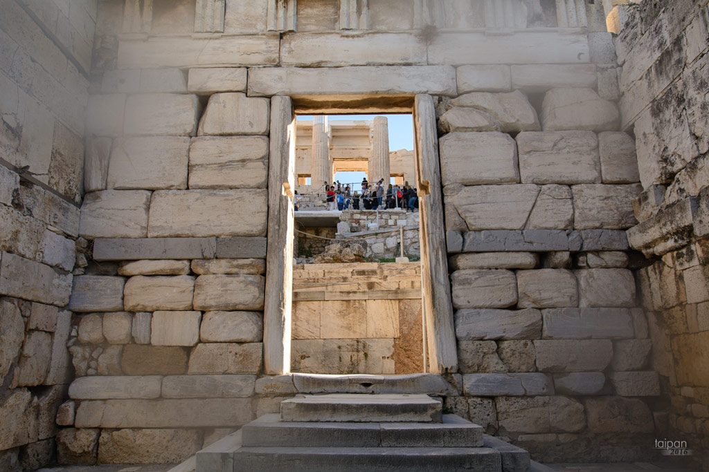 Jedna z bram Akropolu z widocznym rozmyciem powstałym przez zaparowanie obiektywu
