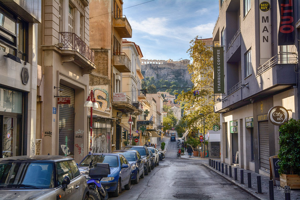 Akropol widziany jest z wielu uliczek dzielnicy Monastiraki
