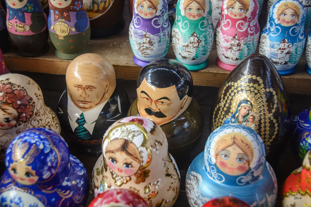 Matrioszka Putina i Stalina, a zaraz obok Matki Boskiej.Wernisaż w Izmailovo - bazar z wieloma ciekawymi rzeczami