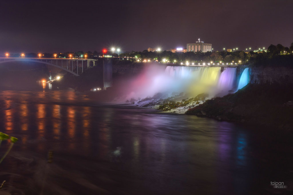 Podświetlany wodospad Niagara widziany od strony kanadyjskiej.