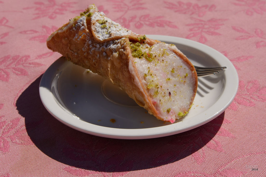 Cannoli - tradycyjny sycylijski deser składający się z chrupiącej rurki nadzianej kremem z sera ricotta; jedyny deser, który zjadłem do końca