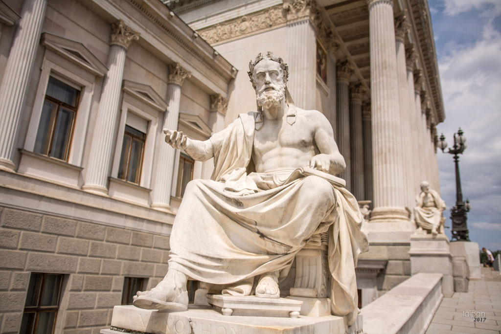 Ciekawe pomniki myślicieli na tle budynku Parlamentu