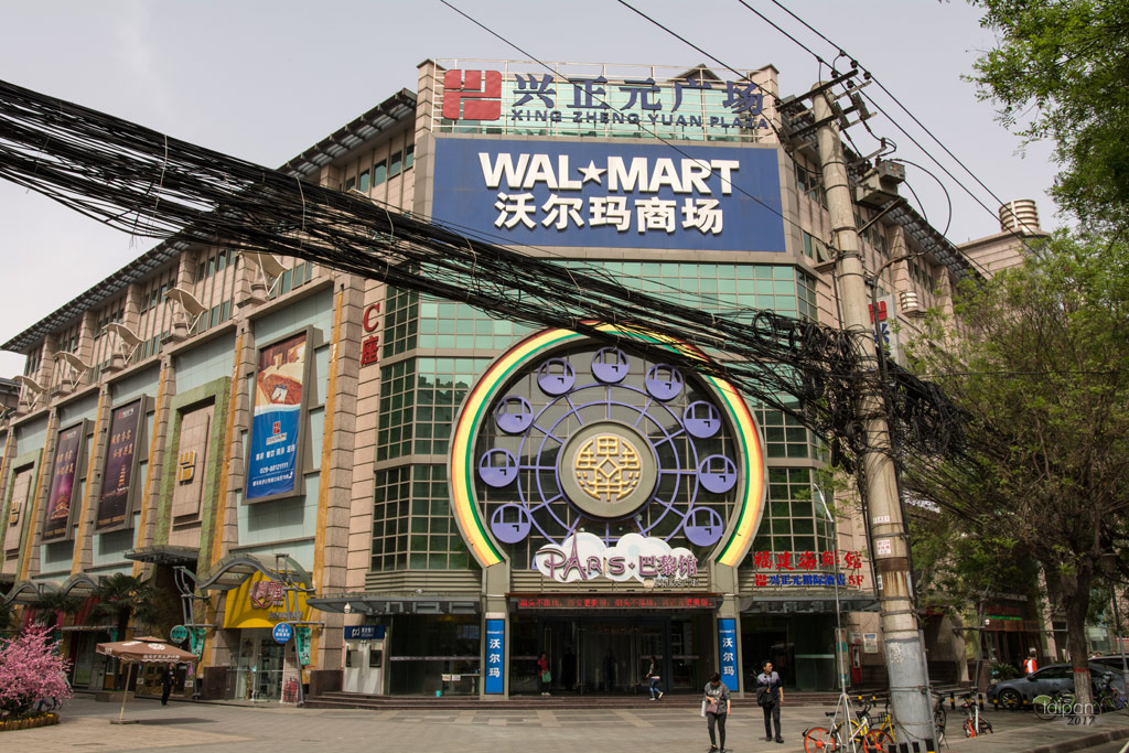 Xi'an - linie energetyczne pełne kabli, a w tle podróbka amerykańskiego Walmarta