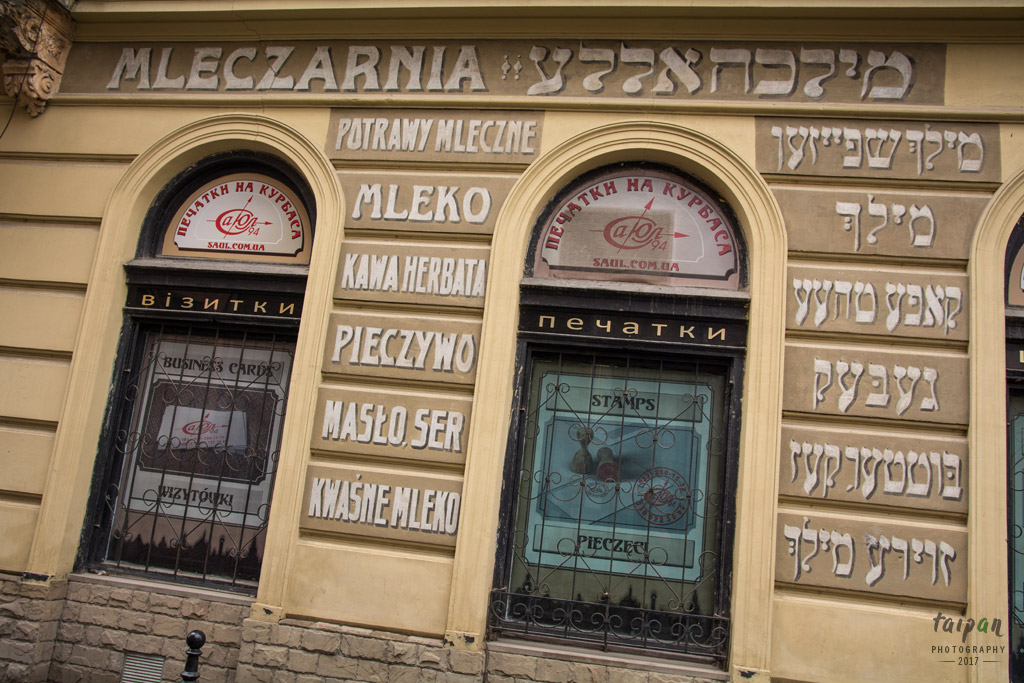 Polskie i hebrajskie napisy "Mleczarnia" przy ulicy Tyktora