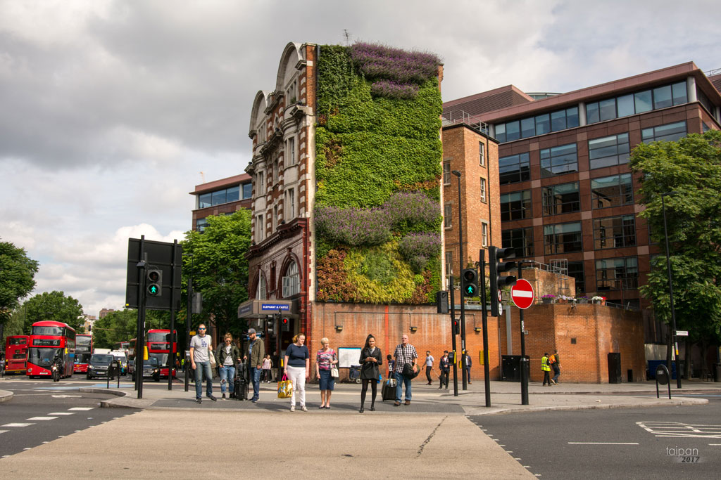 Wejście do metra Elephant & Castle z elewacją porośniętą mchem