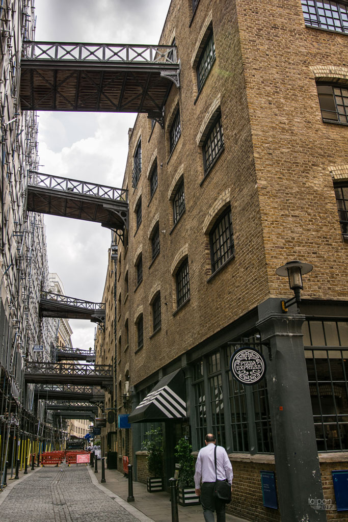 Ulica Shad Thames z charakterystycznymi dla niej mostkami między budynkami