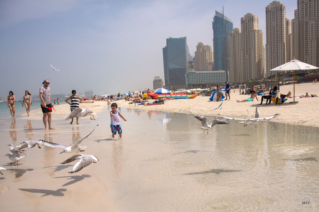Chłopiec straszący mewy na plaży Jumeirah w Marina Dubai