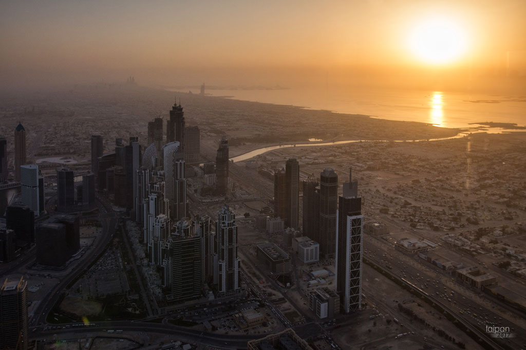 Zachód Słońca widziany ze 125 piętra (456 m) tarasu widokowego w Burj Khalifa. Najdalej widoczny jest zarys Dubai Mariny oraz hotelu Burj Al Arab. A Słońce chowa się za Zatoką Arabską (Perską)