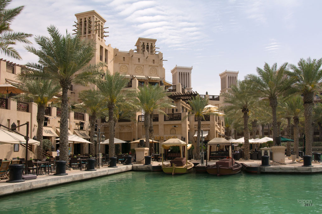 Souk Madinat Jumeirah - jest to centrum handlowe stylizowane arabską architekturą, z kanałami, oazą zieleni i luksusowym hotelem Burj Al Arab w tle