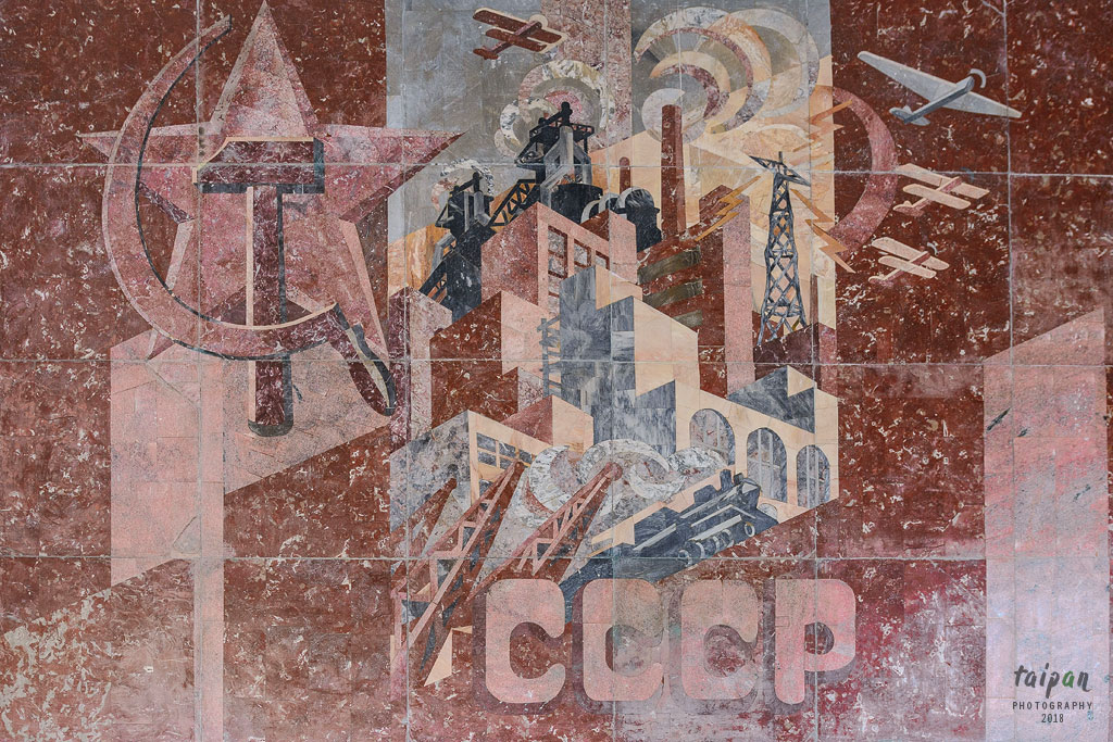 Scena z życia ZSRR (CCCP) przy wejściu do stacji metra Kastrycznickaja. 11 kwietnia 2011 r. na stacji miał miejsce zamach terrorystyczny. W wyniku eksplozji bomby zginęło 15 osób, a 204 zostały ranne.