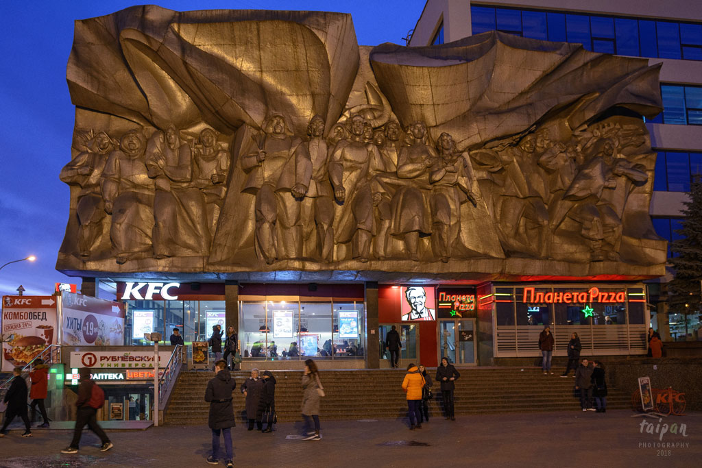 Rzeźba Sowieckiego Domu Mody i kontrastujące KFC