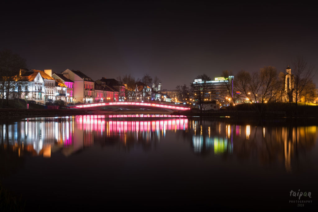 Podświetlone Troickie Przedmieście oraz most łączący Wyspę Łez z lądem
