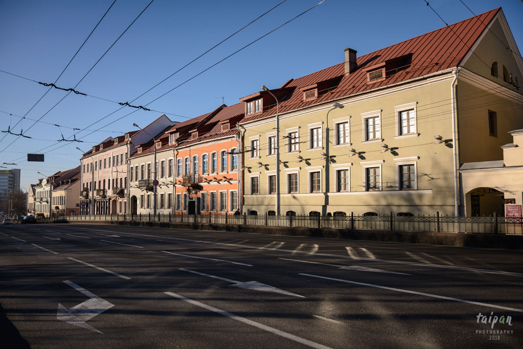 Kamienice na Troickim Przedmieściu. Co ciekawe po Mińsku jeżdżą trolejbusy (na zdjęcu widoczna sieć trakcyjna)