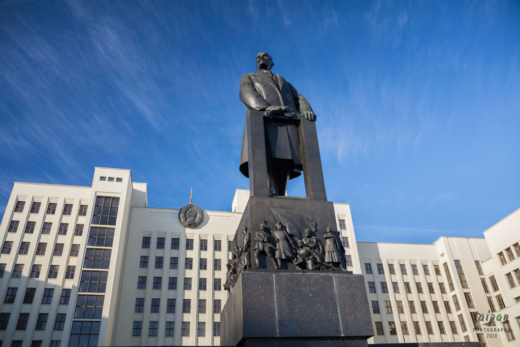 Olbrzymi pomnik Lenina z Domem Rządowym (parlamentem) Republiki Białorusi w tle