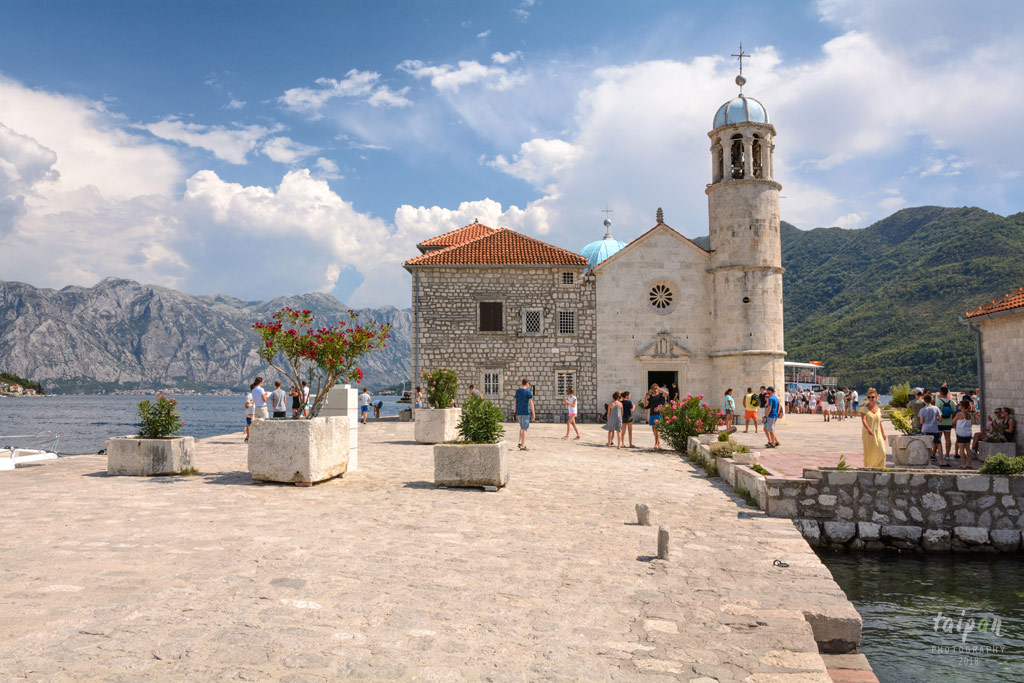 Kościół na wyspie Matki Boskiej na Skale (Gospa od Škrpjela) w Zatoce Kotorskiej. Na wyspę można dostać się wyłącznie drogą wodną.