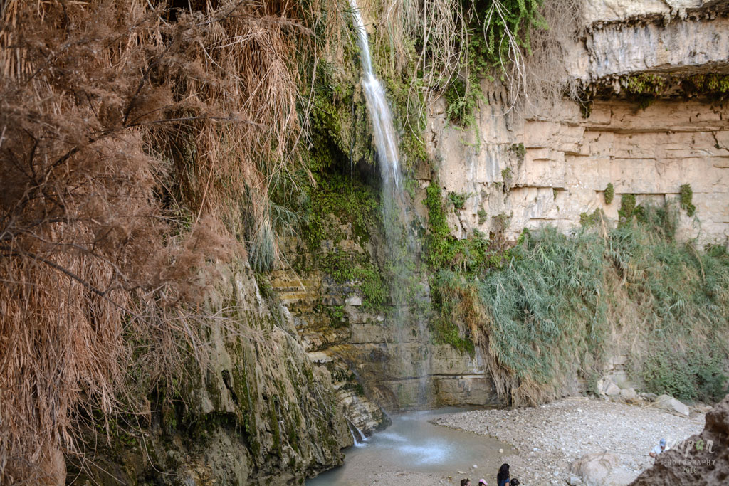 Wodospad Dawida. Park narodowy Ein Gedi to zielona oaza na jałowej Pustyni Judzkiej. Na jej terenie znajdują się wodospady, studnia Dawida i pustynny kanion Nachal Dawid. Słodka woda płynie z podziemnych źródeł z okolic Jerozolimy. Według Biblii schronienie znalazł tutaj Dawid uciekając przed królem Saulem.