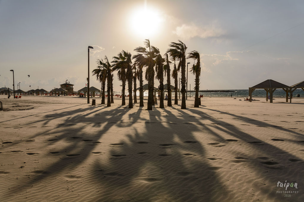 Oazy palmowe na plaży Jerozolimskiej o zachodzie Słońca