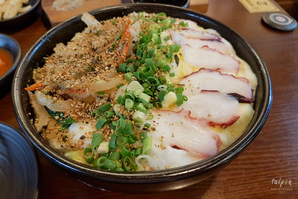 Bardzo dziwne danie. Krojona ośmiornica, z warzywami umieszczona na chmurce z ubitego białka jajeczego, a pod tym zupa z makaronem.